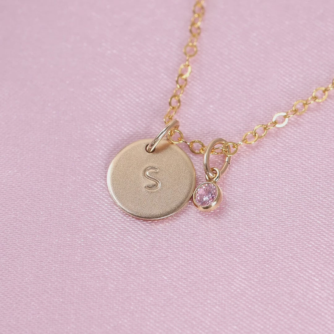 A sleek everyday necklace featuring a hand-stamped initial and a birthstone—personalized just for you or someone you love.